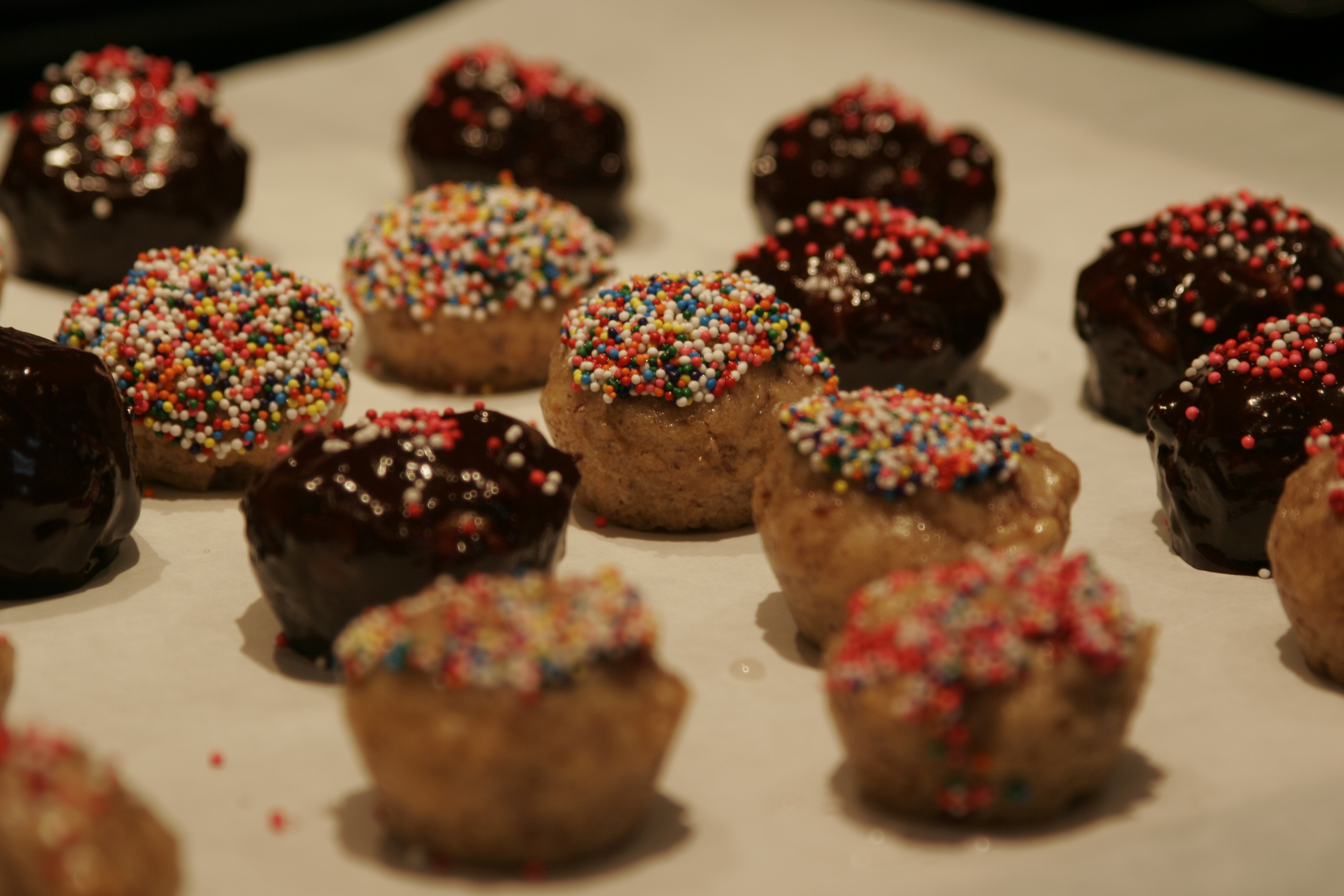 Heat in small saucepan over low heat–stirring constantly–until chips are melted. Dip and roll donuts in chocolate glaze and place on parchment paper to dry. Sprinkle with sprinkles if desired.