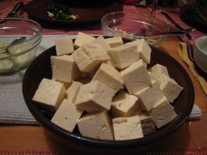 All you need to do: Add 1 teaspoon toasted sesame oil plus 2 teaspoons olive oil (less expensive and higher smoke point than the sesame oil) to a skillet over medium heat. Add 1-block-worth of tofu cubes or a large bunch of dark leafy greens pieces along with a tablespoon of soy sauce. Cook for 5-10 minutes, covered, adding water 2 tablespoons at a time as needed to prevent sticking. Add more soy sauce as needed for flavor. Shepow! Delicious.