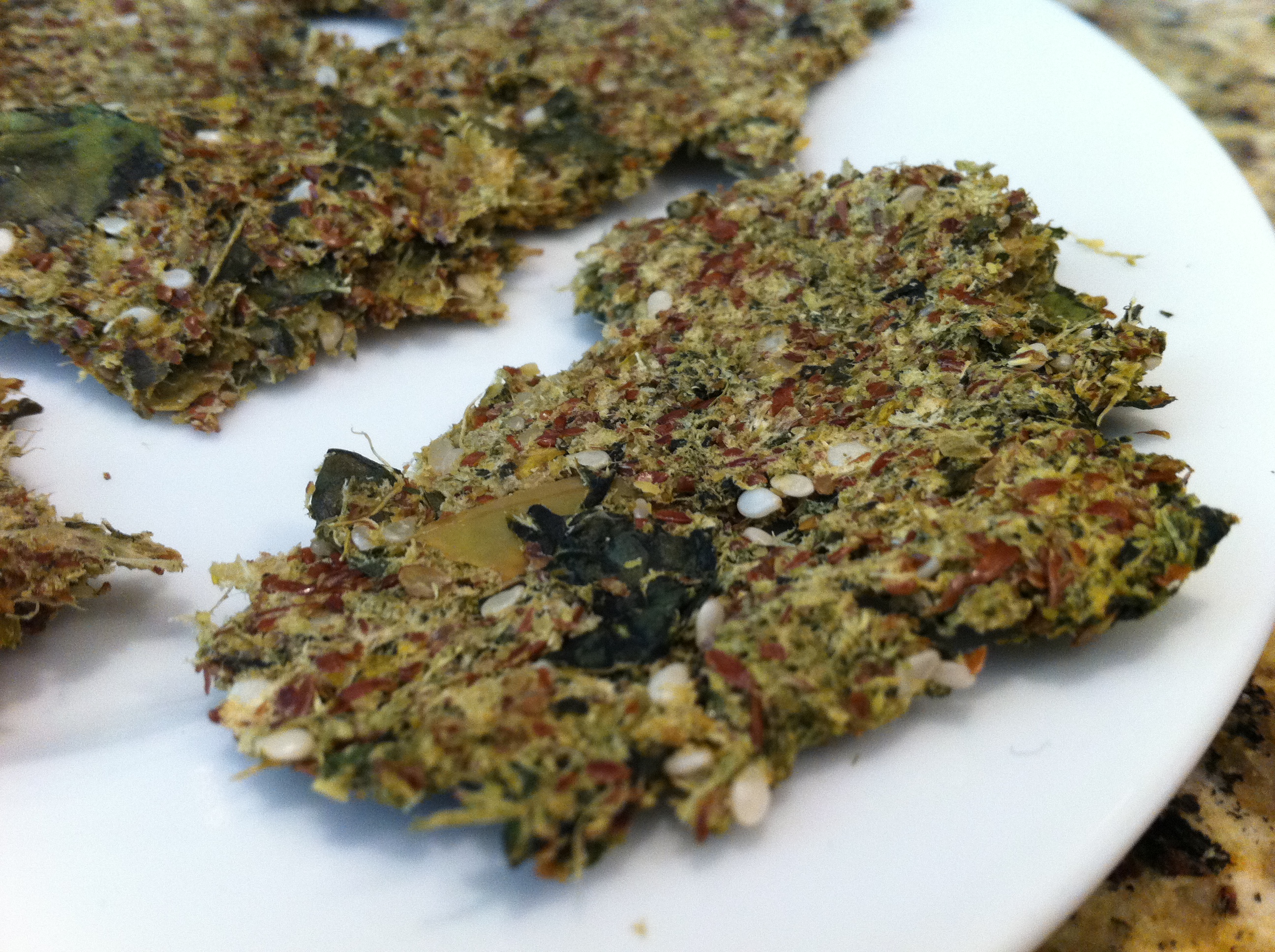 Combine all ingredients and then smoosh out onto a cookie sheet lined with parchment paper. Bake at 200 degrees for 4-6 hours with oven door opened a crack. (Or put in your food dehydrator for 4-6 hours).