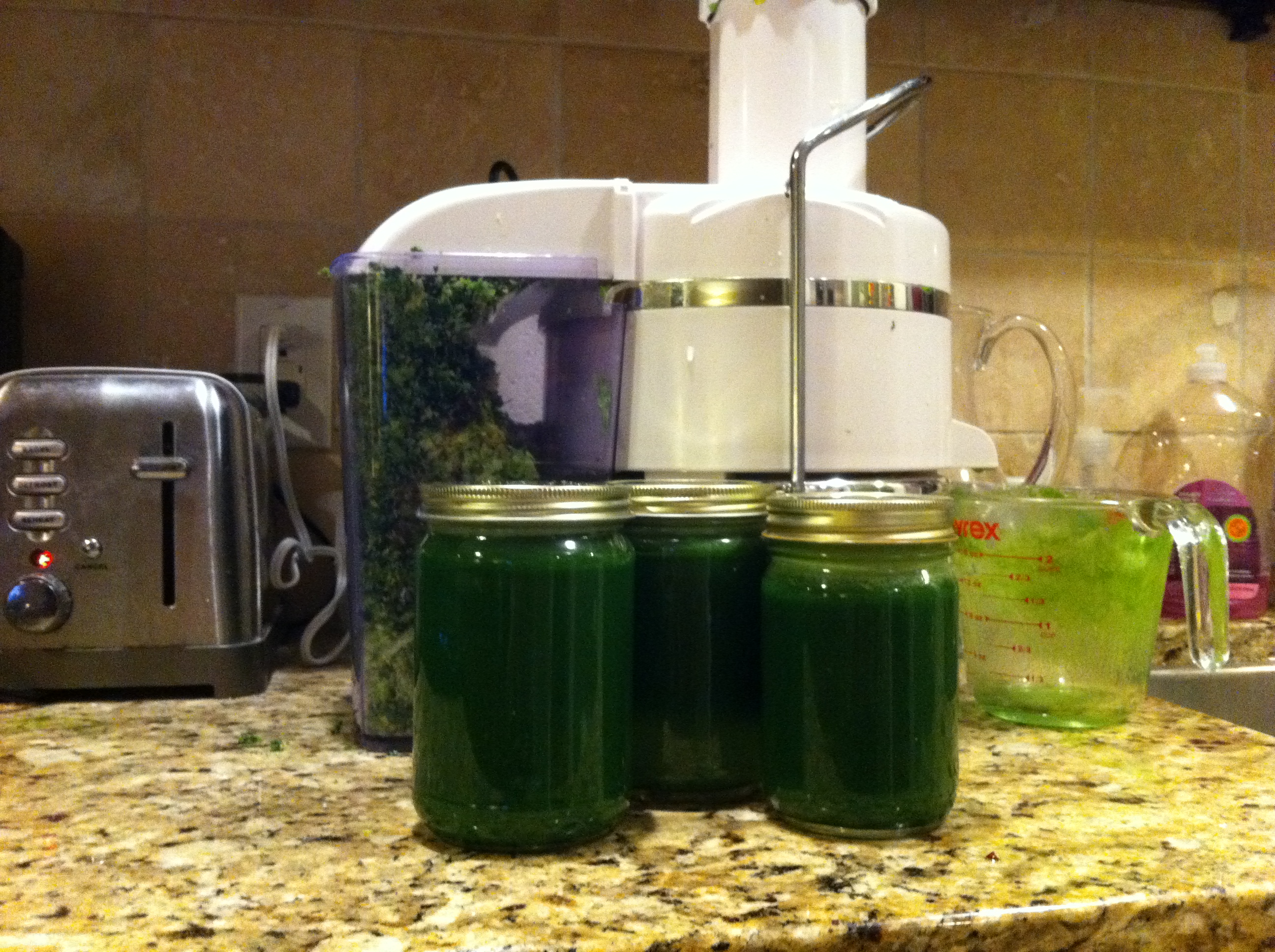To start out Day 1, here’s a quick video of the Green-Apple Juice in a juicer (ignore my 6-year-old daughter who thinks she’s Inspector Gadget). I do prefer this concoction juiced vs. blended, but blending is perfectly wonderful too. If you’re blending and you don’t have a high-power blender like a Vitamix or a Blendtec, the first thing you need to do is put one of those on your 2012 holiday wish list. Or, perhaps you need to think about rewarding yourself at the end of this Detox with one of those. The next thing you need to do is if you don’t think your blender can handle the raw apple and leafies even with the 4-8 ounces of water and ice, consider using a food processor for the veggies and apples, and then blending that concoction with the water and ice. It can’t hurt.