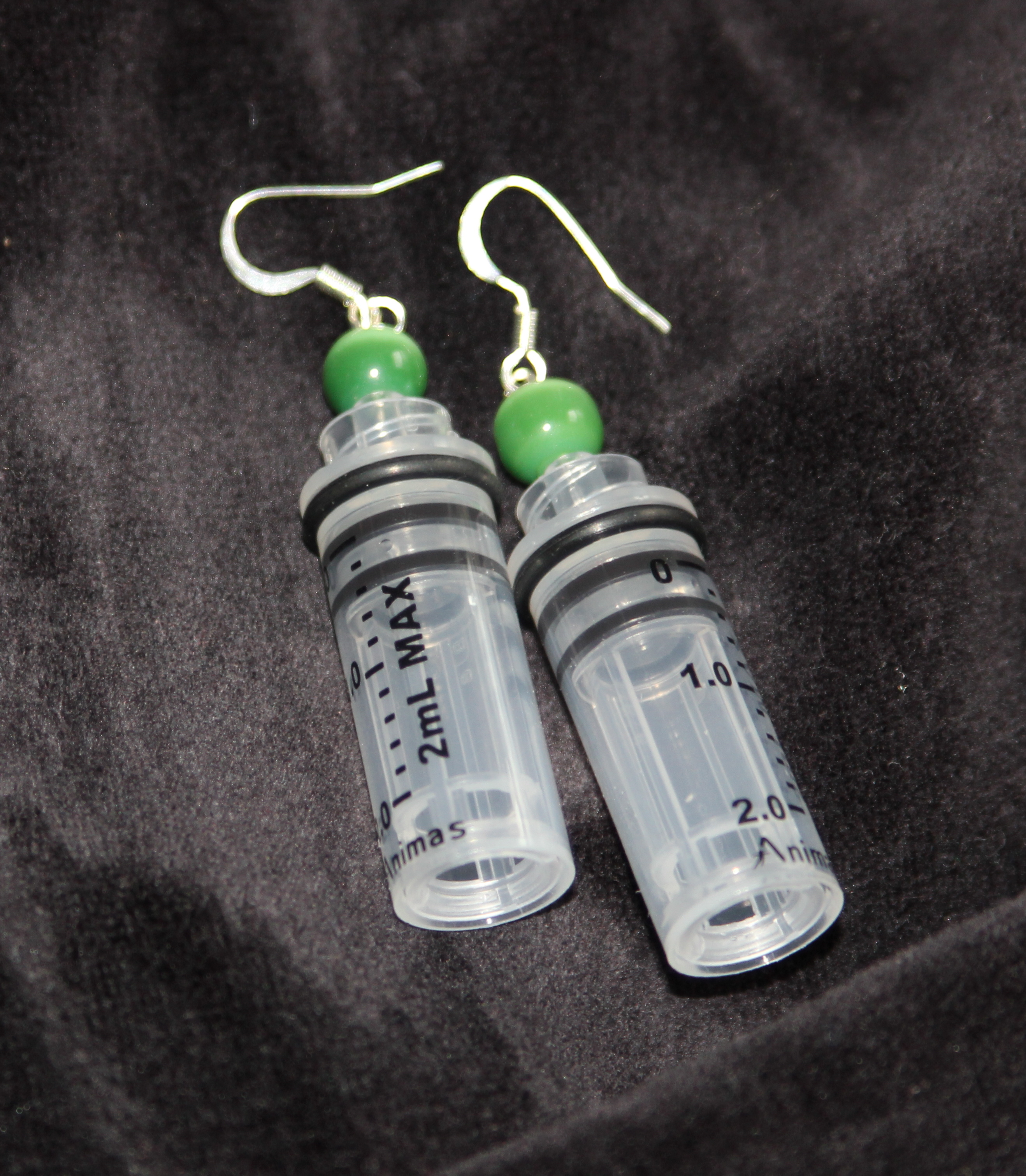 "Insulin on Board" Earrings: $10. Made from full-size used insulin pump cartridges. ($9.50 goes to the JDRF)